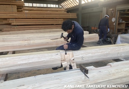 自社作業場では「墨付け(すみつけ)」が終わり、「刻み(きざみ)」と 「加工」...